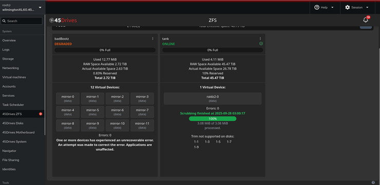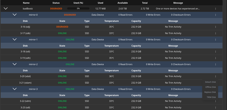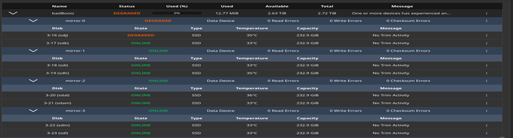 - Once in the Pools tab, we’ll have to identify the failed drive, as it should be listed with either sector errors, as faulted, failed, or degraded.